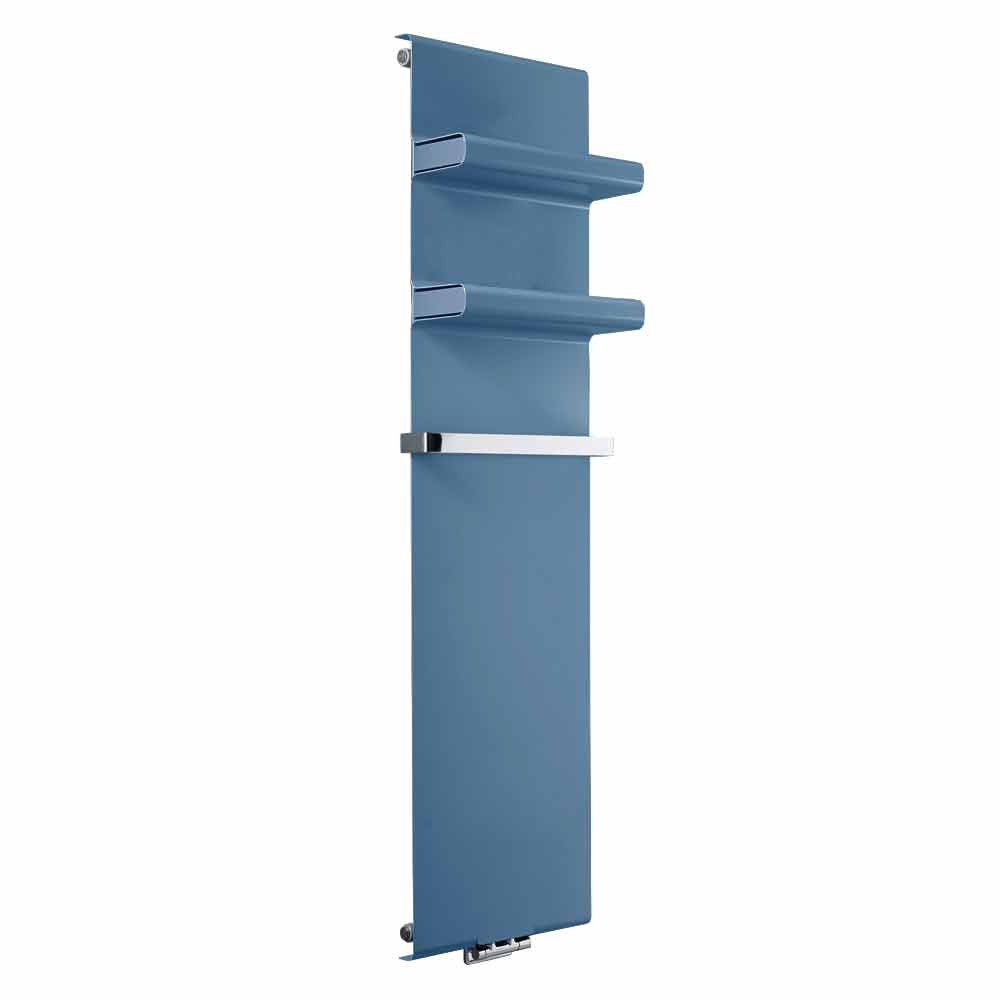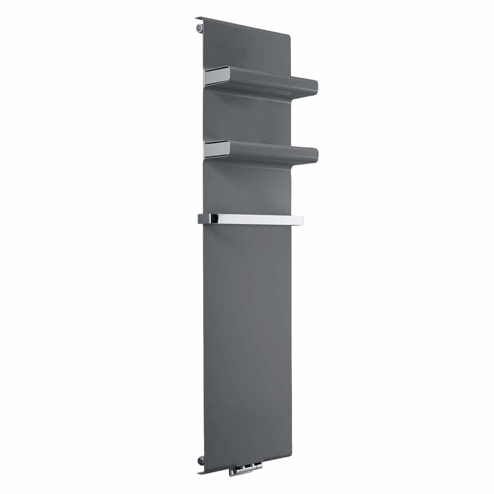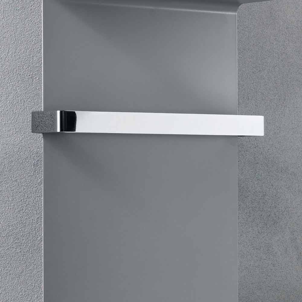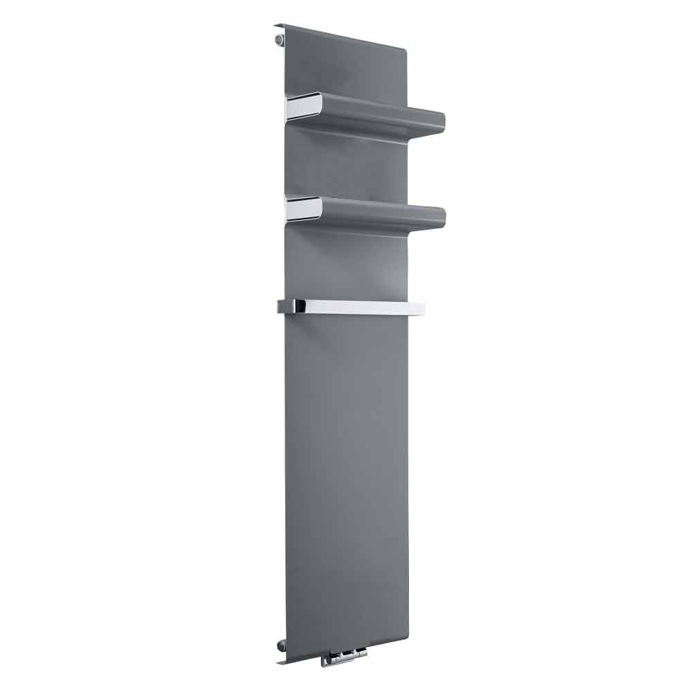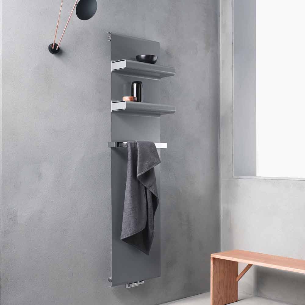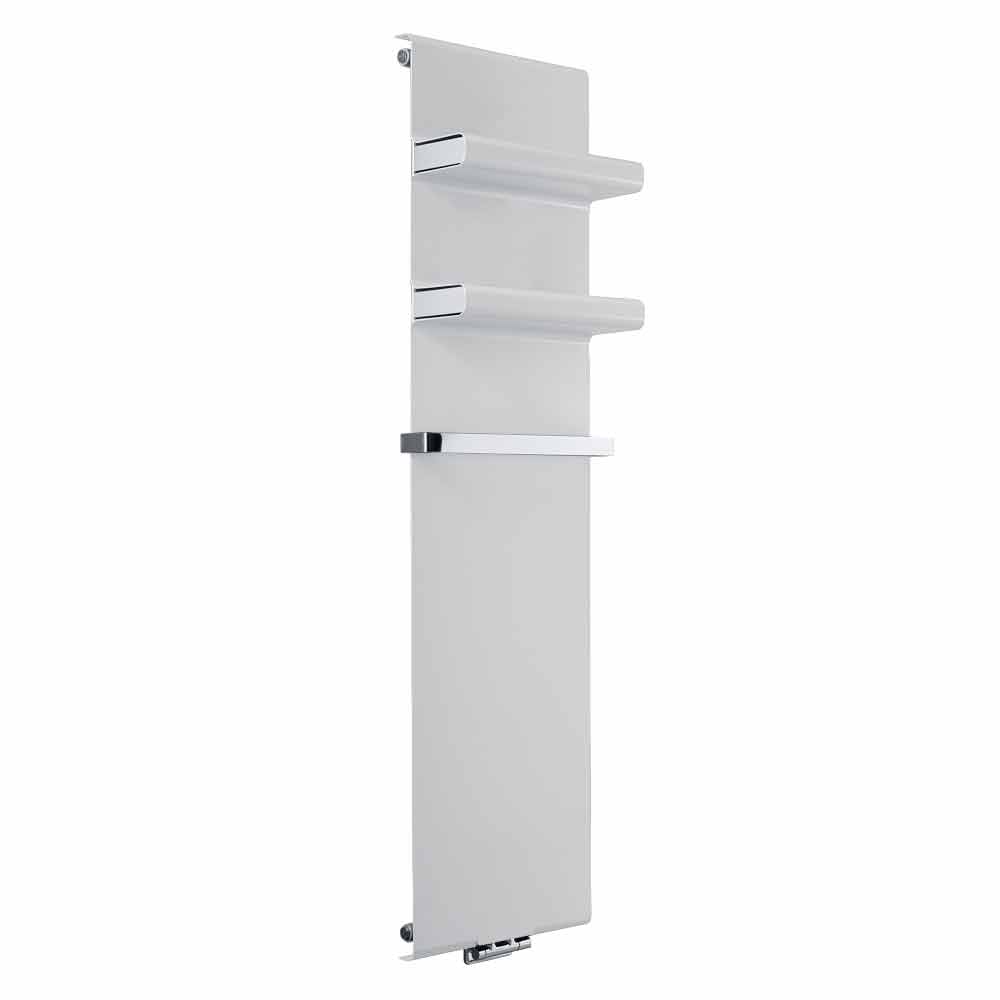 Esta placa radiante hidráulica presenta un diseño moderno y minimalista con prácticos y elegantes estantes integrados con tapa incluida y toallero cromado, que alarga 4 cm el ancho del radiador.