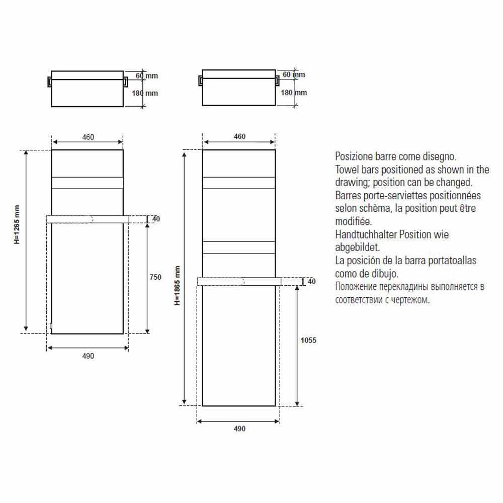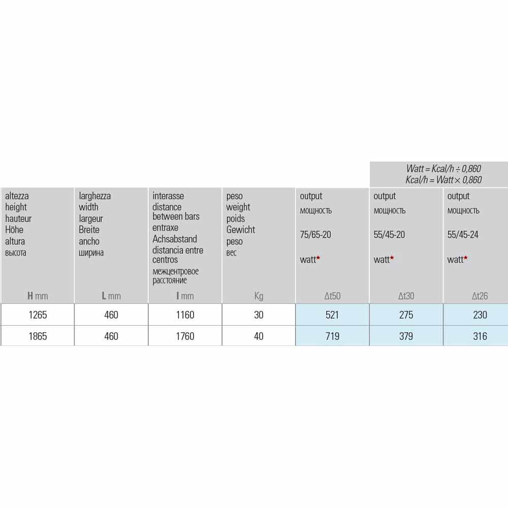 • H 1865 x L 460 x Inter. 1760 mm x rendimiento w (Δt50 *) 719; Rendimiento w (Δt30 *) 379; Salida w (Δt26 *) 316 (2 estantes).