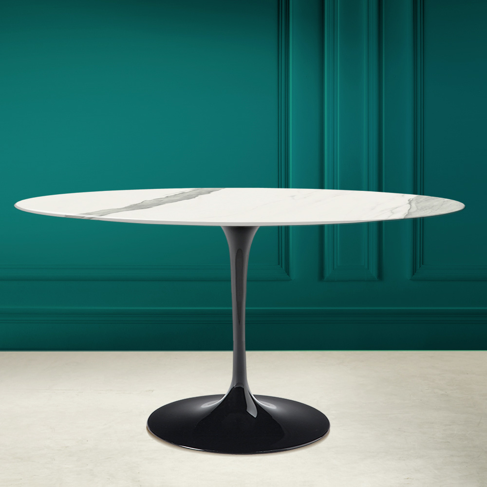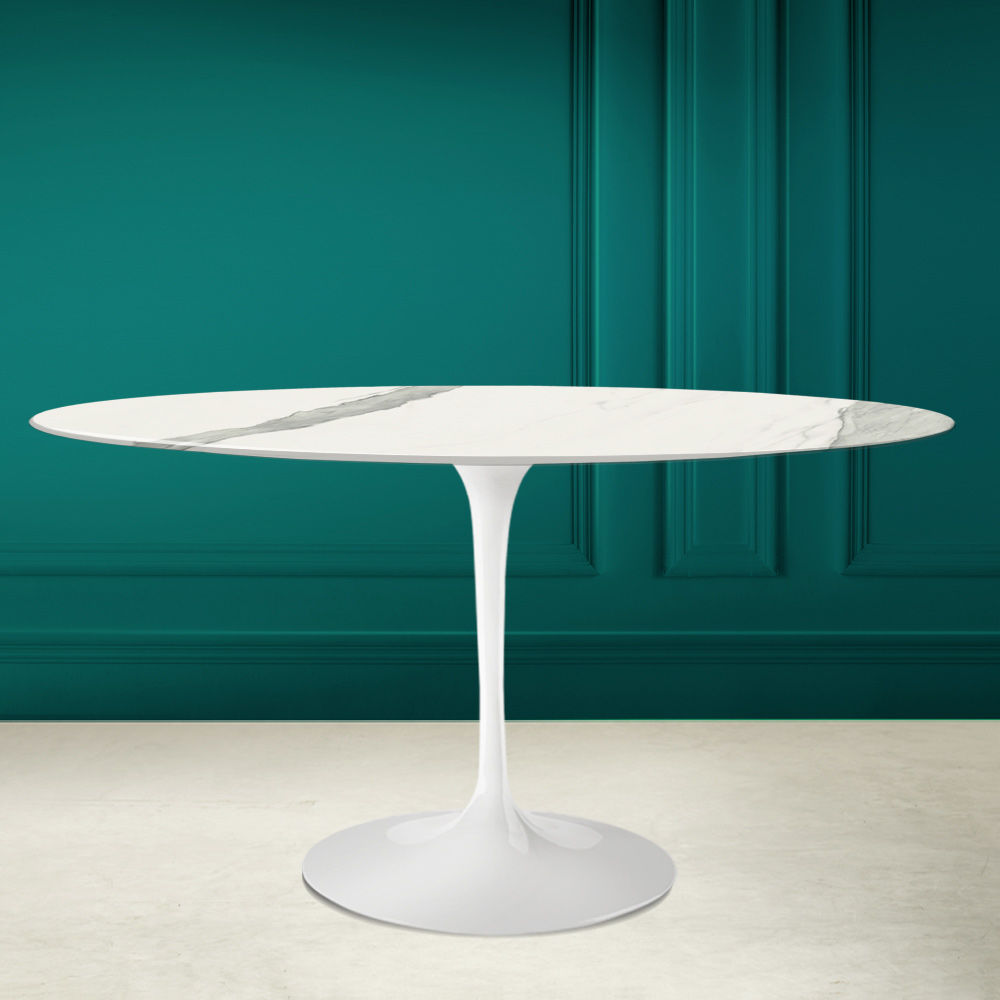 Mesa de comedor totalmente made in Italy con sobre ovalado de cerámica statuario fulvein, efecto estatuario opaco pasante , y base de aluminio pulido. Esta mesa es el elemento perfecto para dar un toque original a cualquier salón y cocina gracias a la forma ovalada y a la cerámica estatuario fulvein. La forma ovalada es cada vez más utilizada para mesas de comedor ya que permite una gran prácticidad y funcionalidad y da un toque innovador gracias a la nueva y refinada línea. La cerámica fulvein statuario se caracteriza por vetas vivas y complejas que se adaptan perfectamente para completar el estilo de cualquier estancia, desde moderna a contemporánea.