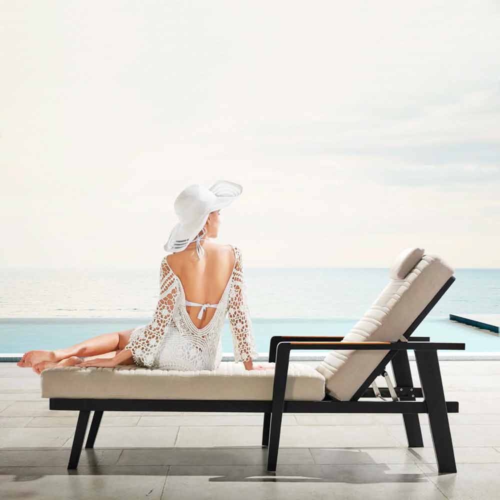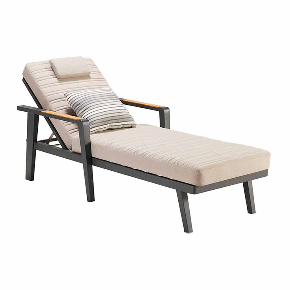 Esta tumbona se caracteriza por un diseño simple, lineal y elegante. Tiene una estructura dealuminio pintado en polvo gris antracita con apoyabrazos de superficie de madera de teca. Los cómodos cojines están hechos de tejido de fibra textil Olefina con reposacabezas . Finalmente, el respaldo reclinable asegura el máximo confort.