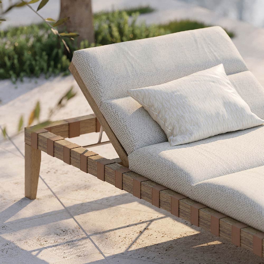 Tumbona de exterior fabricada íntegramente en Italia con cojines acolchados de tela y estructura de madera de teca desgastada. La tumbona está adornada en la estructura con cuero cosido . Este producto de líneas delicadas y esenciales es perfecto para todos aquellos que aman el estilo moderno y minimalista. La forma orgánica y las patas esculturales se combinan para crear un elemento simple con proporciones armoniosas adecuado para ser insertado en cualquier ambiente exterior para dar una atmósfera encantadora con líneas simples y un gusto retro. Los materiales utilizados para la producción garantizan calidad y resistencia incluso con el paso del tiempo y hacen que este accesorio de decoración sea perfecto para cada situación y ocasión de uso.