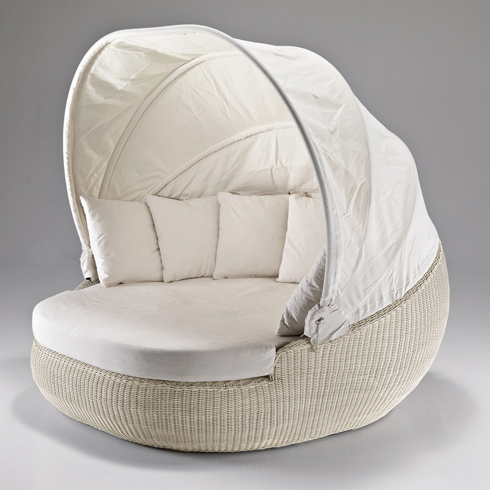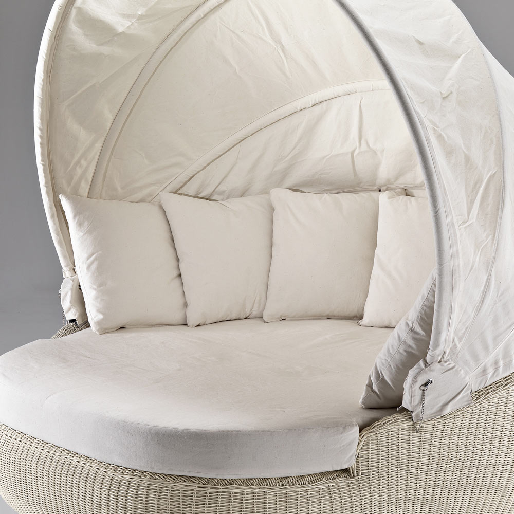 Esta tumbona se caracteriza por su diseño circular y su tejido completo. Sus volúmenes redondeados y sinuosos combinan a la perfección con el gran asiento que permite disfrutar de una relajación óptima. La capota de apertura y cierre hace que esta tumbona sea original y práctica, ya que permiten disfrutar tanto del sol como de la sombra en los momentos más calurosos del día.