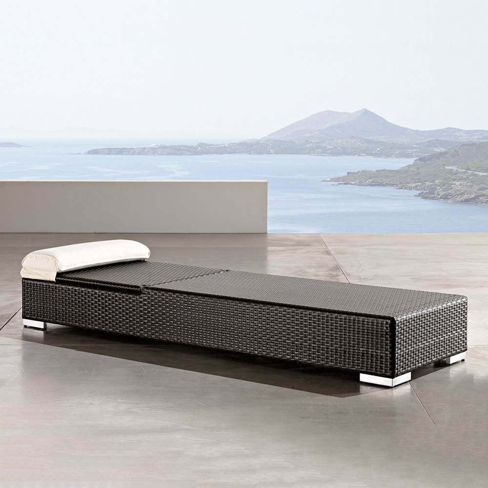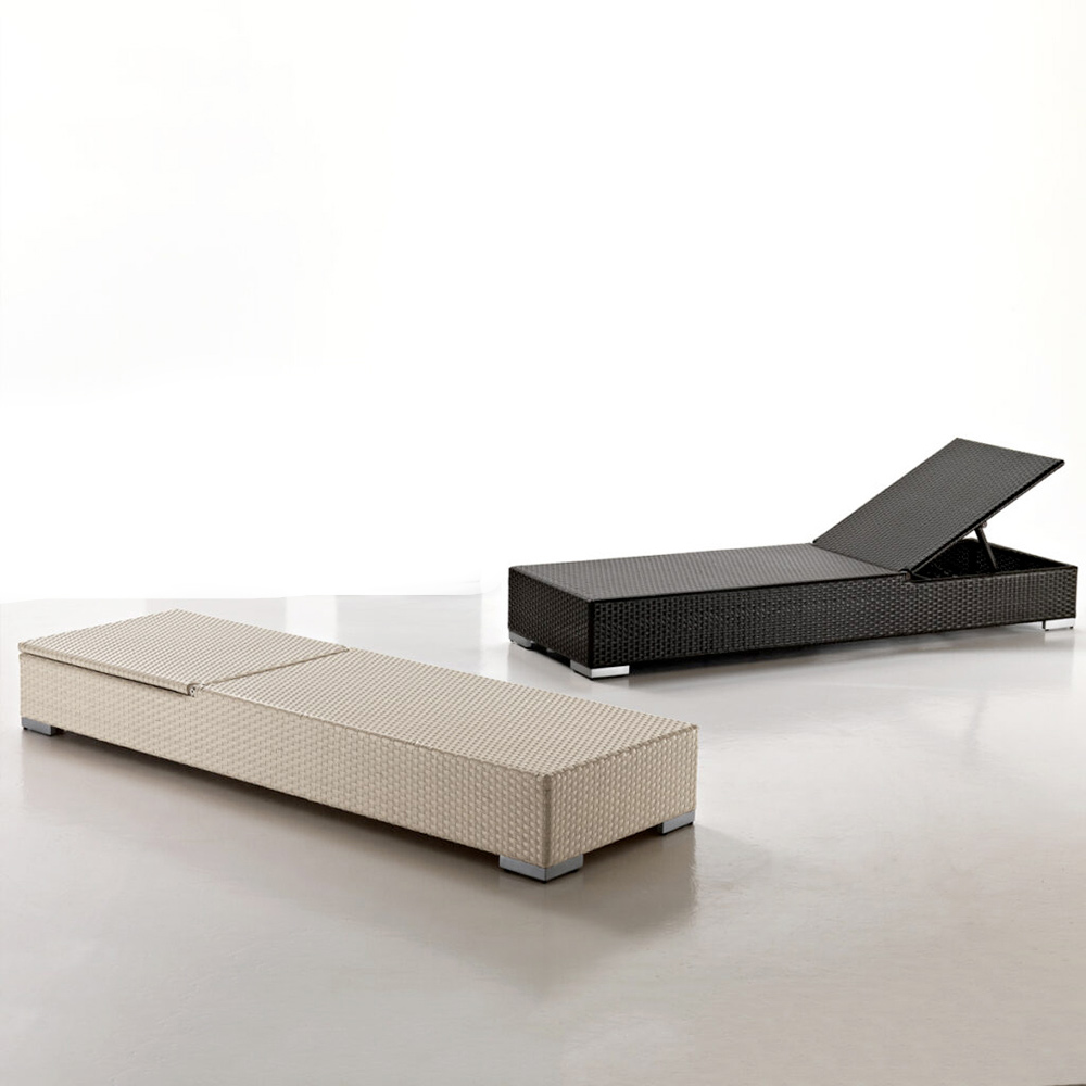 Tumbona de exterior fabricada en aluminio tubular y Poliratán con líneas limpias y esenciales que le permiten no pasar nunca de moda junto con la alta calidad de los materiales que la componen. El respaldo reclinable en diferentes posiciones para un confort máximo y adaptable a cada necesidad.