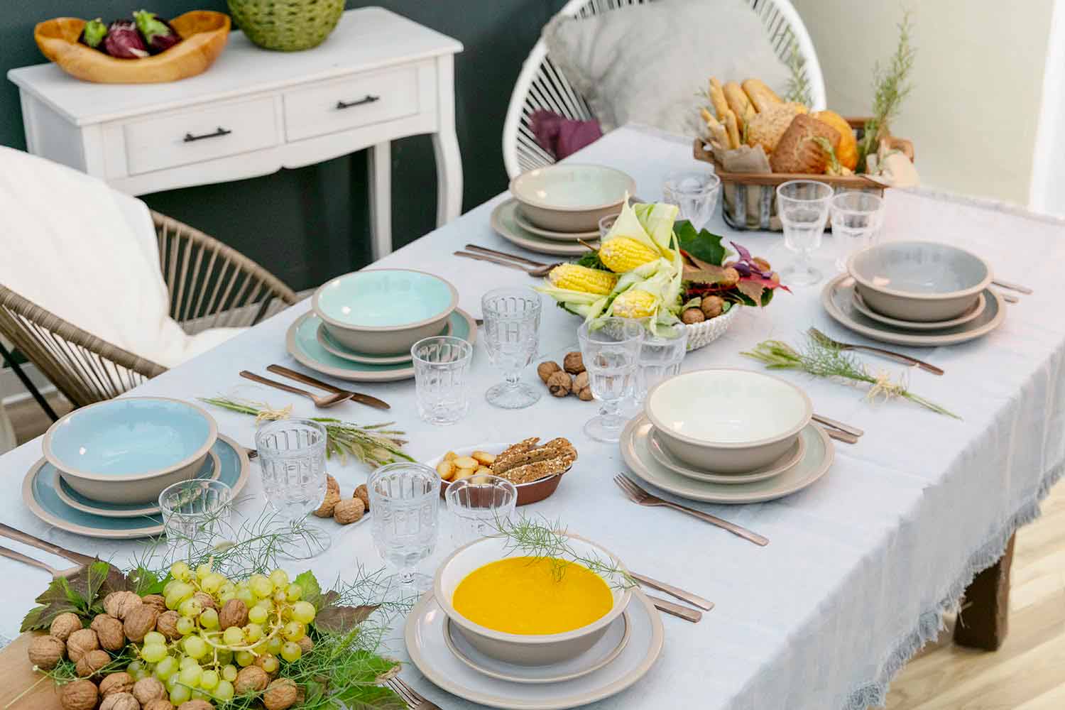 - El servicio consta de 6 platos planos, 6 platos de sopa, 6 platos de fruta.