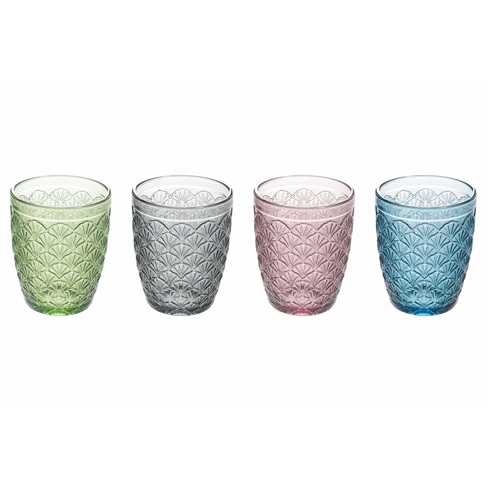 Esta línea de vasos de agua trae arte a la mesa.La superficie tallada se inspira en el Art Déco, volviendo a proponer los motivos geométricos que caracterizaron toda la producción de la época. La composición se vuelve actual gracias a los cuatro colores diferentes para cada mesa que serán tan originales y de moda.