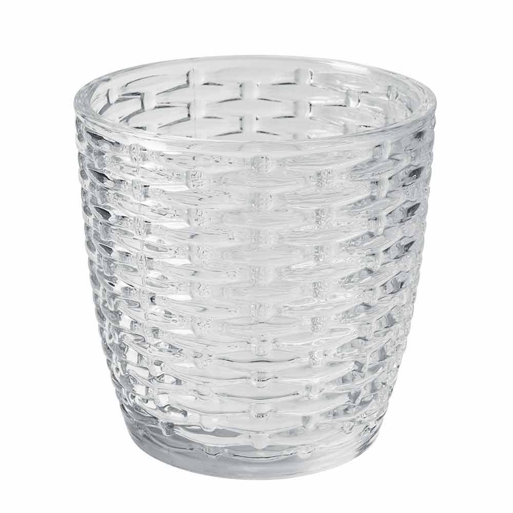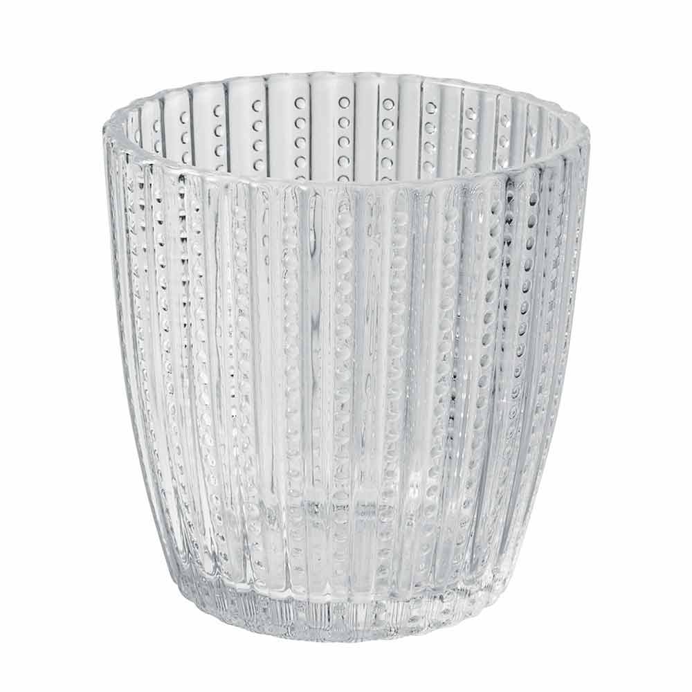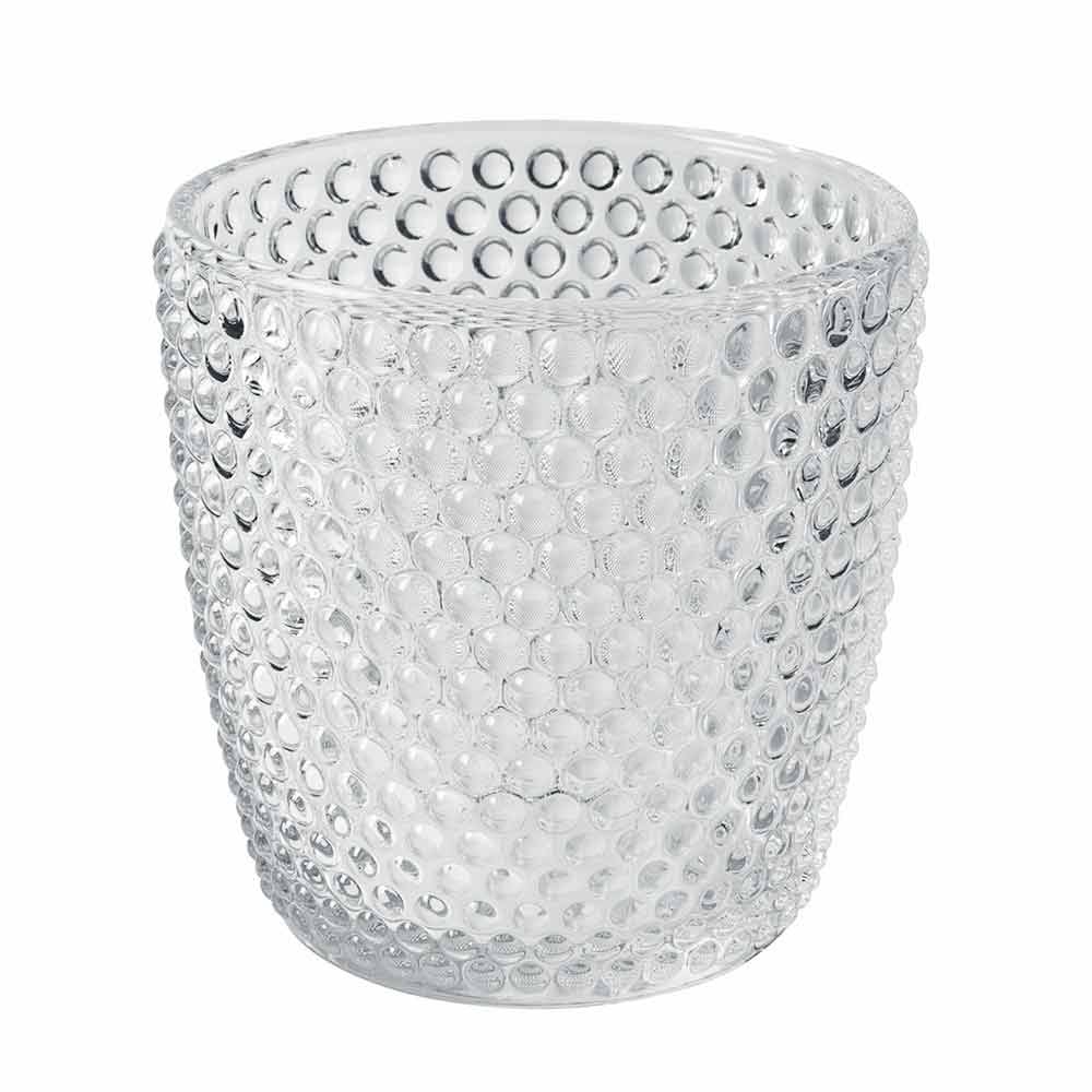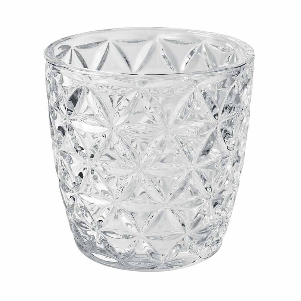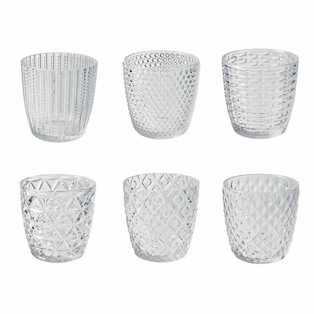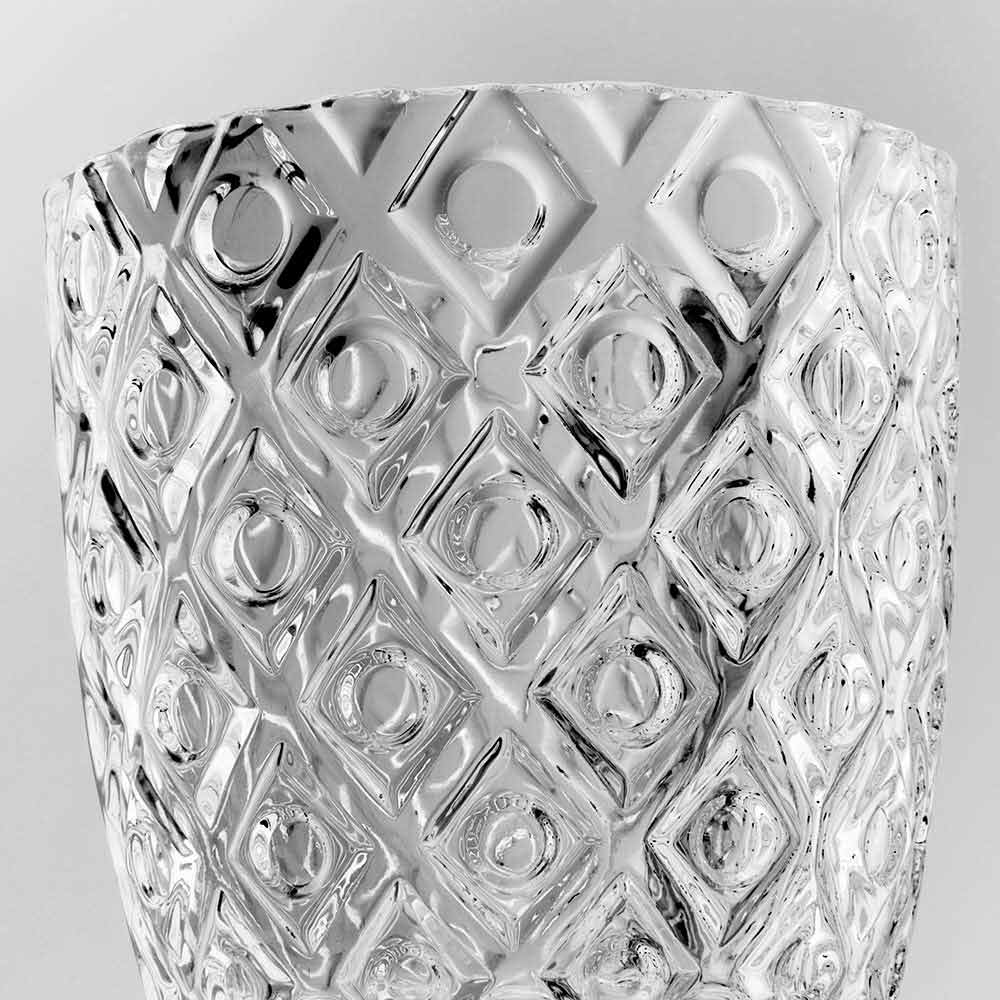 Vasos de agua fabricados en vidrio transparente y superficie trabajada con diferentes decoraciones geométricas, 12 piezas.
