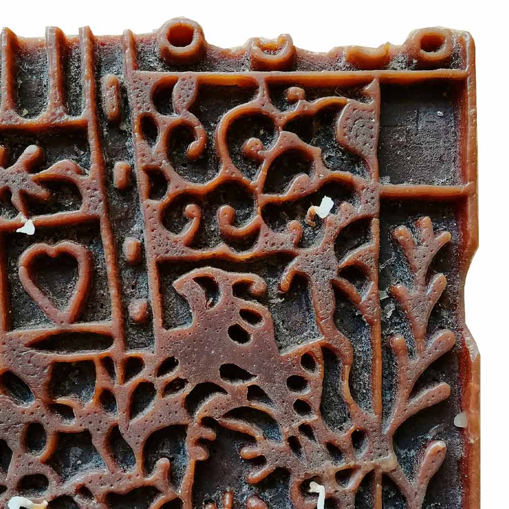 Vela artesanal con diseño étnico en cera marrón perfumada con canela Made in Italy.
