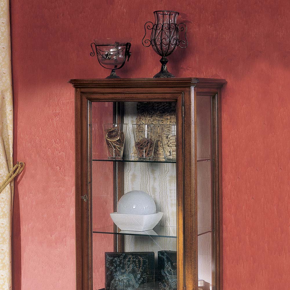 Vitrina con estructura en partículas de madera chapada Tanganica/toulipier , marcos en toulipier/ayous, fondos y respaldos en MDF y contrachapado con 1 puerta de cristal con 2 estantes de cristal y 1 cajón enteramente Made in Italy.