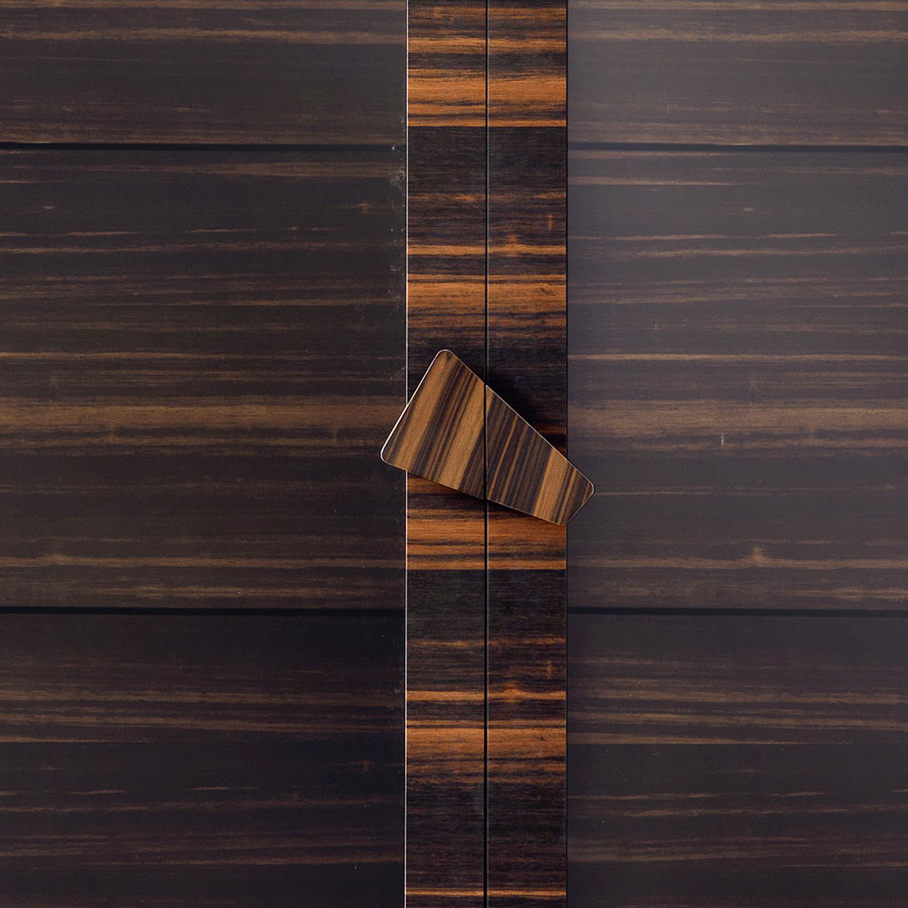 La vitrina tiene una estructura de múltiples capas y madera maciza de toulipier y chapada con ébano. La base está realizada en madera maciza pintada de touliper. En el interior hay algunos estantes de vidrio ahumado, mientras que la cómoda interna está disponible bajo petición .