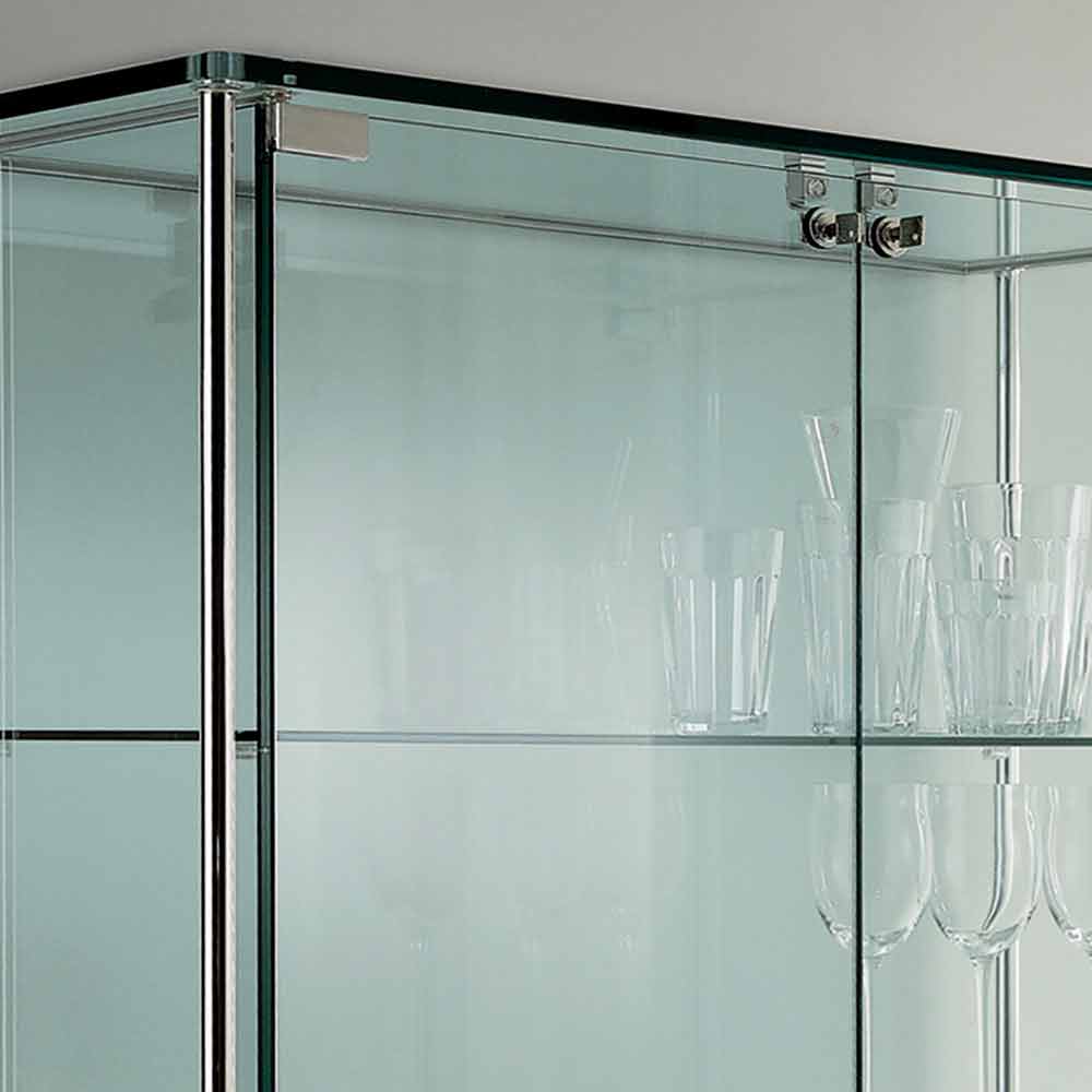 La vitrina de dos puertas está fabricada íntegramente en vidrio templado transparente con cierre y soportes metálicos de acero inoxidable.