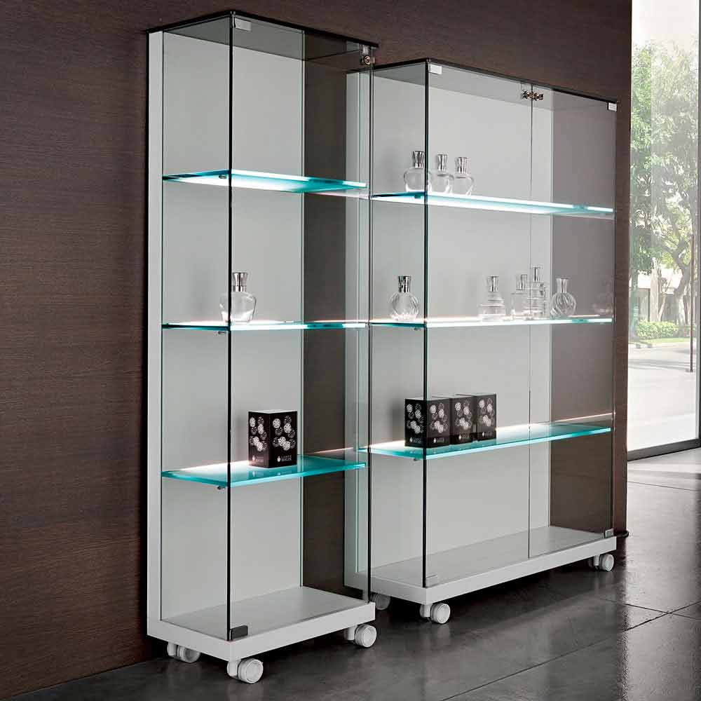 La vitrina de dos puertas con ruedas para facilitar el movimiento está realizada en vidrio transparente templado y estructura en madera lacada en blanco mate.