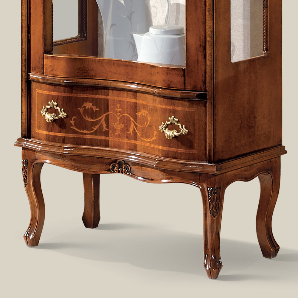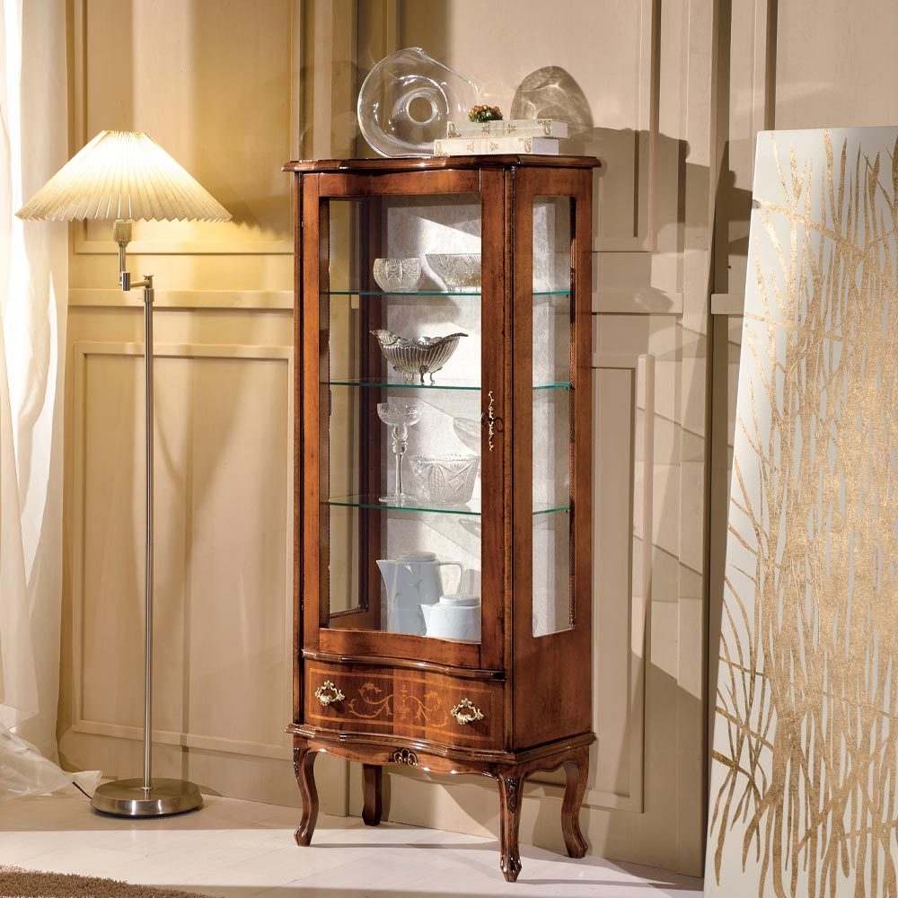 Vitrina de salón realizada en preciosa madera acabado nogal con una puerta y un cajón. Elegante y atemporal, esta vitrina de estilo clásico es ideal para crear ambientes impactantes. Totalmente fabricado en Italia y hecho a mano por expertos maestros artesanos , acabado con sabiduría y gusto por la elegancia. La producción se lleva a cabo utilizando materiales nobles y realizando el trabajoamano con el máximo cuidado y profesionalismo que distingue a los productos Made in Italy .