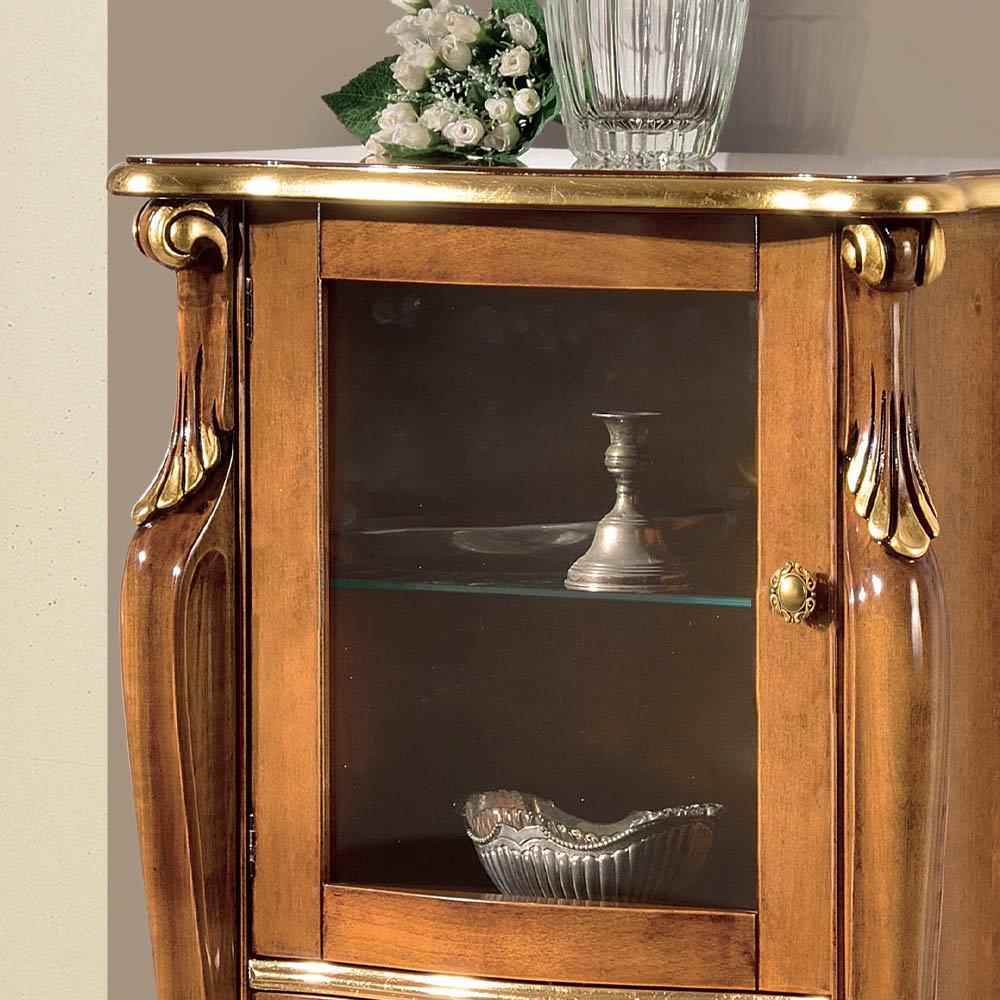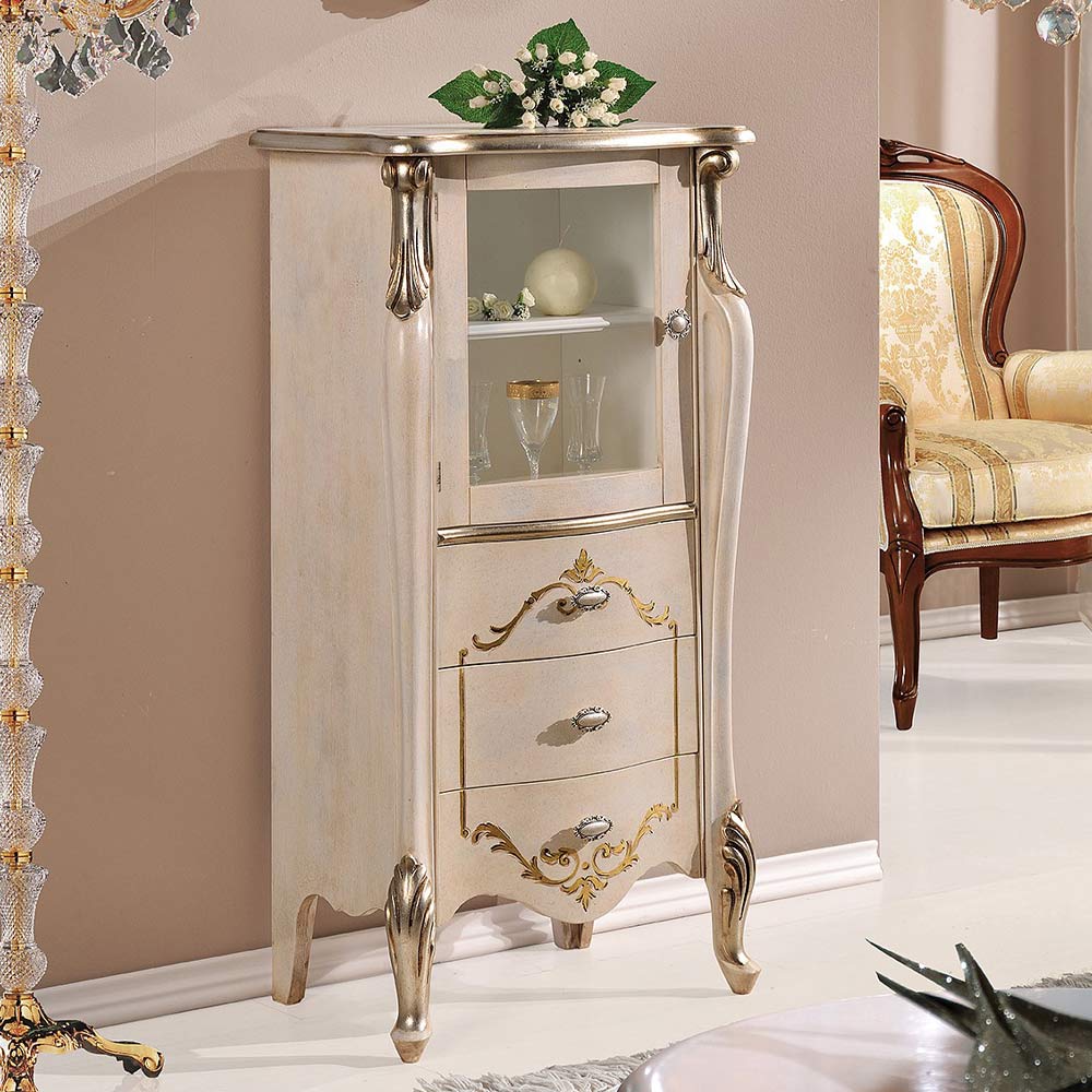Vitrina para salón con estructura de madera y completa con puerta de cristal y 3 prácticos cajones diseñados para amueblar tu salón con una elegancia atemporal. Disponible en dos variantes: nogal Bassano y acabado oro antiguo o en madera blanca y plata . Un complemento único y refinado, realizado íntegramente en Italia por expertos maestros artesanos , maestros del arte que terminan cada complemento con sabiduría y gusto por la elegancia. La producción se lleva a cabo utilizando materiales nobles y realizando el trabajoamano con el máximo cuidado y profesionalismo que distingue a los productos Made in Italy .