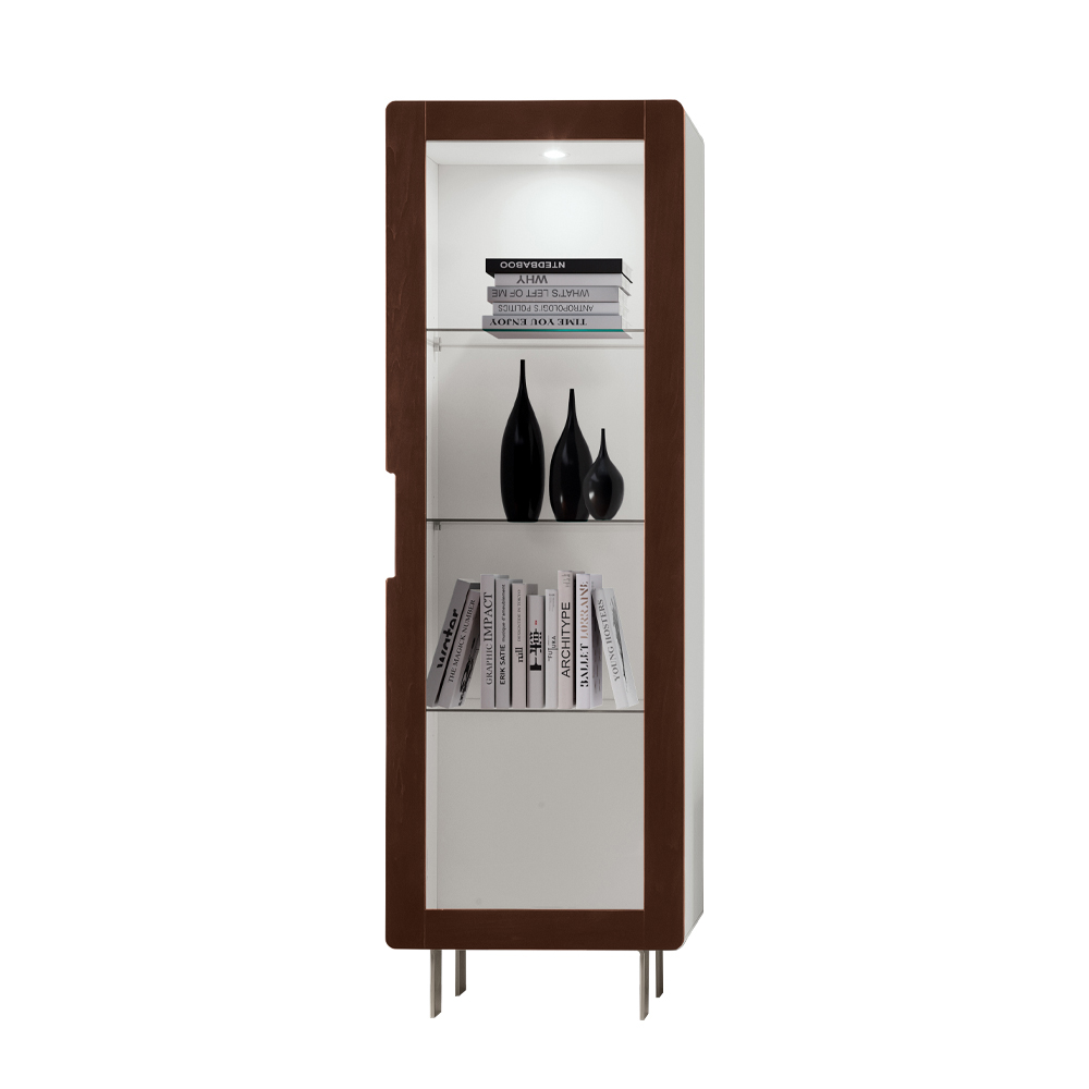 La vitrina para salón se caracteriza por su diseño sencillo y esencial, perfecta para amueblar un salón, un pasillo, un dormitorio y todas las demás estancias. Esta vitrina se compone de patas de hierro con acabado níquel , carcasa de MDFcon acabado blanco y puerta de cristal con marco exterior de madera maciza de tulipán con acabado Canaletto y 3 estantes internos de cristal.