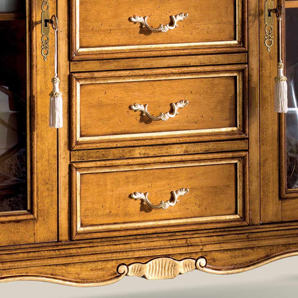 Vitrina de salón de estilo clásico realizada en preciosa madera de nogal Bassano y acabado oro envejecido , con 2 puertas de cristal y 5 cajones. Elegante y atemporal, esta vitrina de estilo clásico es ideal para crear ambientes impactantes. Totalmente fabricado en Italia y hecho a mano por expertos maestros artesanos , acabado con sabiduría y gusto por la elegancia. La producción se lleva a cabo utilizando materiales nobles y realizando el trabajoamano con el máximo cuidado y profesionalismo que distingue a los productos Made in Italy .