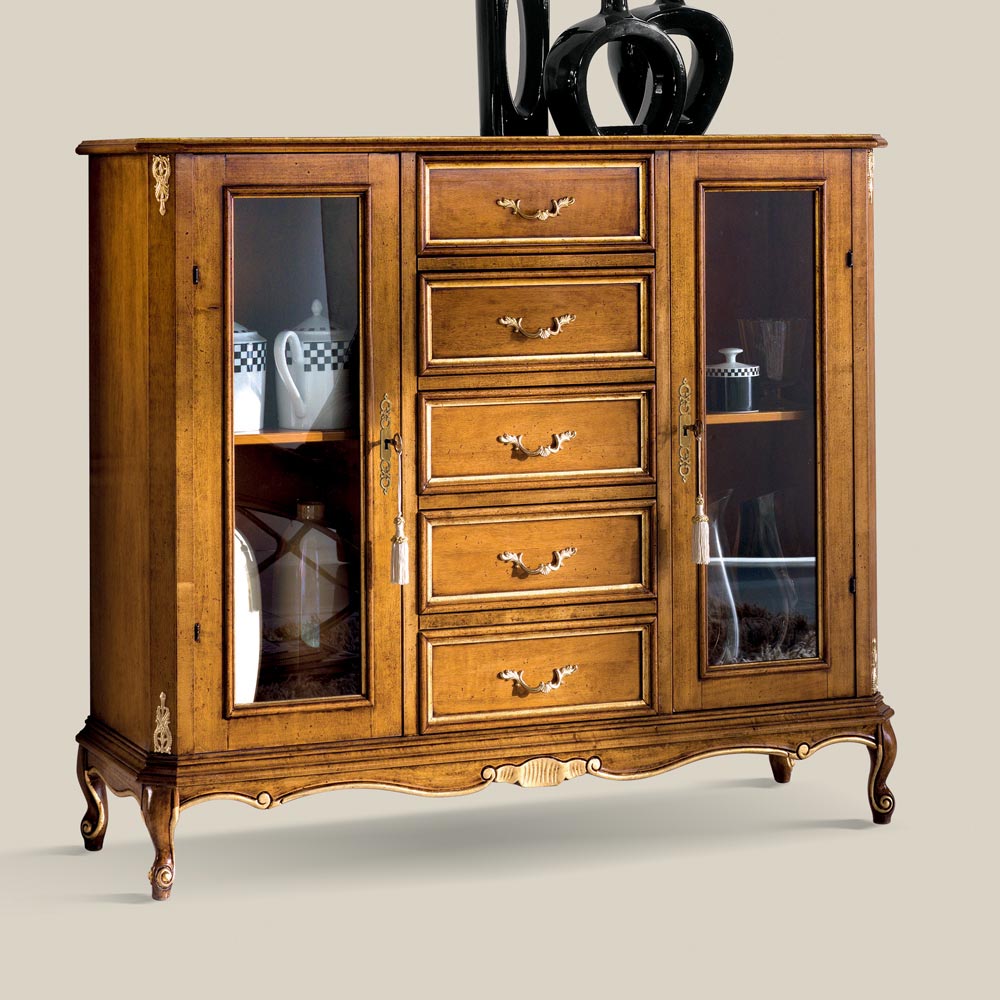 Vitrina de salón en madera con 2 puertas y 5 cajones Made in Italy.
