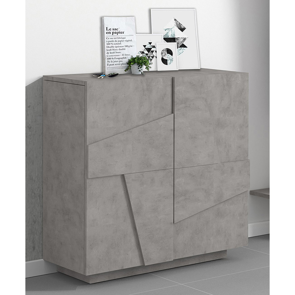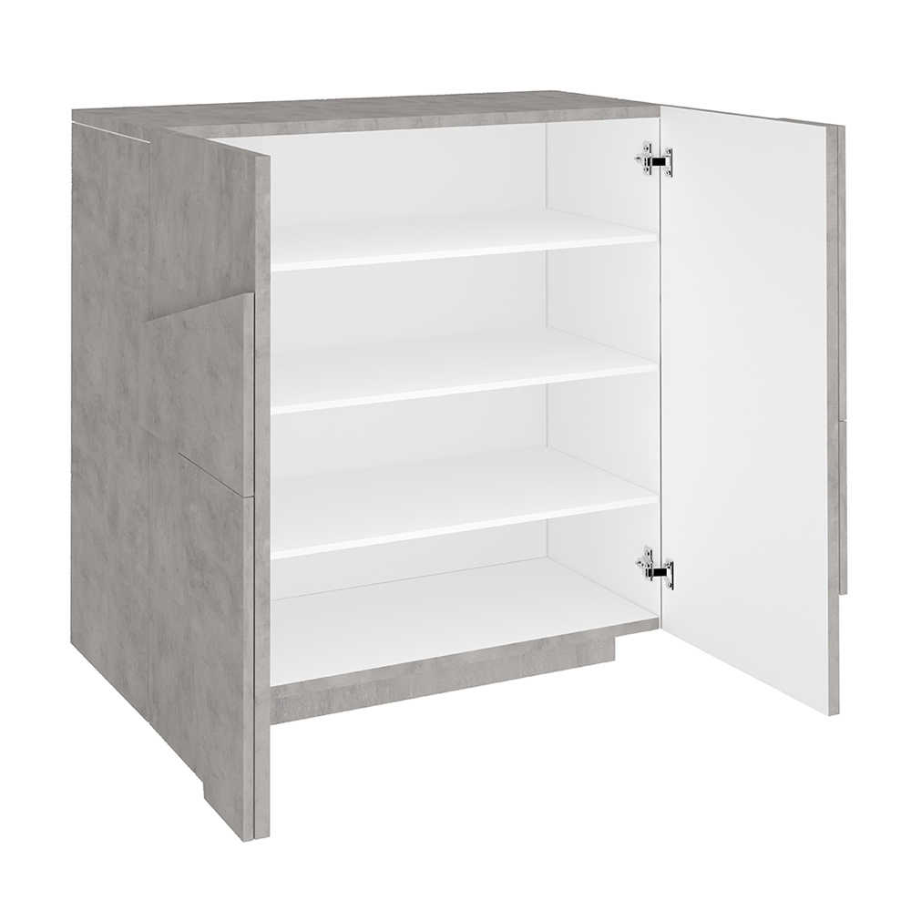El zapatero se compone de 2 puertas batientes especiales por la talla geométrica en relieve en la superficie, que cierran 4 compartimentos contenedores , que garantizan un gran espacio de almacenamiento. Está fabricado en melamina y es 100% Made in Italy . Este producto se presta para completar la decoración de cualquier estancia gracias a sus acabados sencillos y elegantes que aportan al ambiente un toque único e inolvidable. El material utilizado garantiza calidad y resistencia incluso en el tiempo.